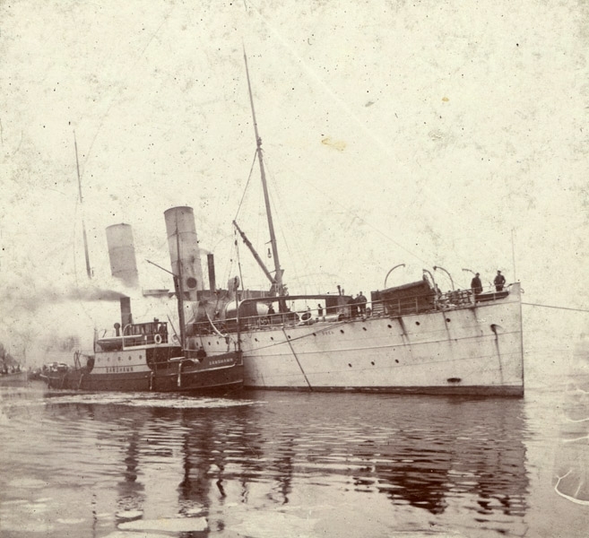 Ångaren Svea efter strandningen vid Stavsten, när ångaren bogserades in i Trelleborgs hamn av bärgningsbåten Sandhamn,1901, fotot skänkt av fru Annie Wallenberg 1937, acc-nummer 7416.