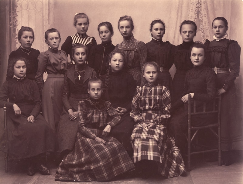 Skolklass? Gruppfoto flickor 1901, Stående 1. Rosvall, 2. Billing Hilda, 3. Bengtsson Gerda, 4. Svensson Gerda, 5. Lund Hilda, 6. Holmgren Klara, 7. Selander Louise, 8. 9. 10. Sittande 1. 2. Fru Ljungner, 3. Emmy Jönsson, 4. Dagmar Lund (Källarmästaredotter Tre Lejon), Främst 1. Hulda Hedin musikaffär, 2. Ebba Lundgren, 15483.