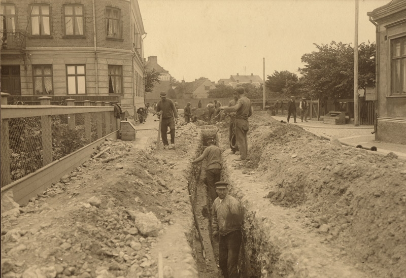 Titel: Vattenledningsbyggande,Valldammsgatan, till vänster efter staketet nygatan.