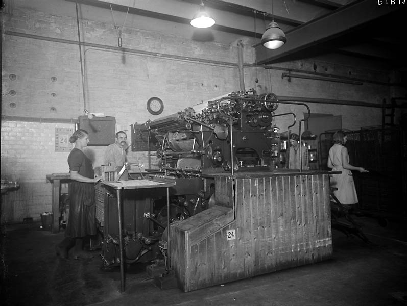 Bleckfabriken Malmö. Interiör industri. Maskinhall, manliga och kvinnliga arbetare.