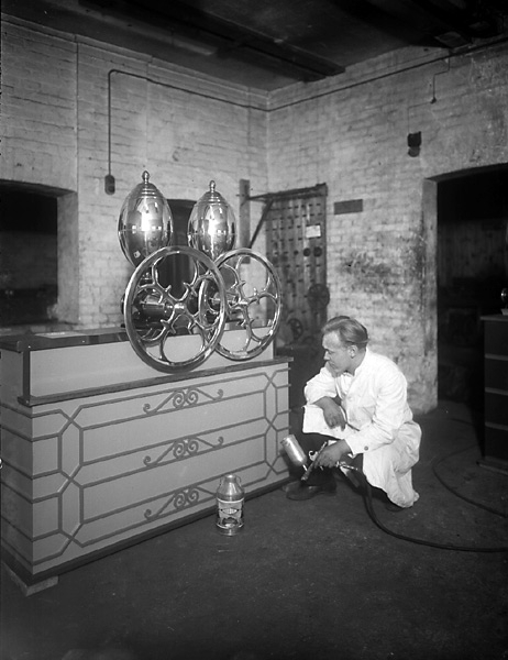 Okänd industri. Interiöri. Man sprutmålar disk till kafferost.