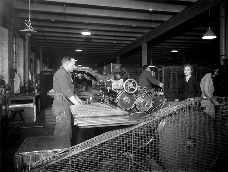 Bleckfabriken Malmö. Interiör industri. Maskinhall med män och kvinnor.