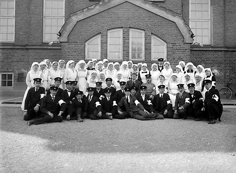 Titel: Röda korset vid Kyrkskolan. Män och kvinnor i rödakorsuniform, vid Kyrkskolans östra sida.