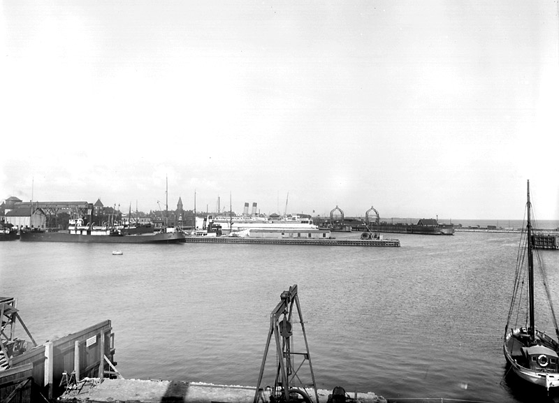 Trelleborgs hamn. I förgrunden ser man stapelbädden till J C Petersens varv. Mitt i bilden mittbron. Bortom den ligger tågfärjan Gustaf V vid östra kajen. Längst till vänster transportbanan från sockersilon till kajen. I bakgrunden ser man Posten och Centralstationen. Reproduktion.