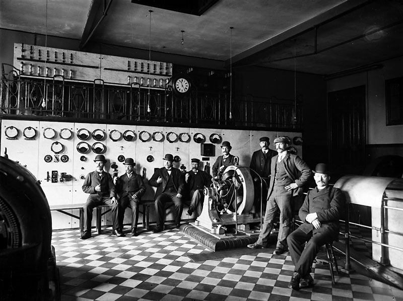 Elverket. Män i kostym utanför elverkets första maskinhall. Korsningen Nygatan, Östra Vallgatan.