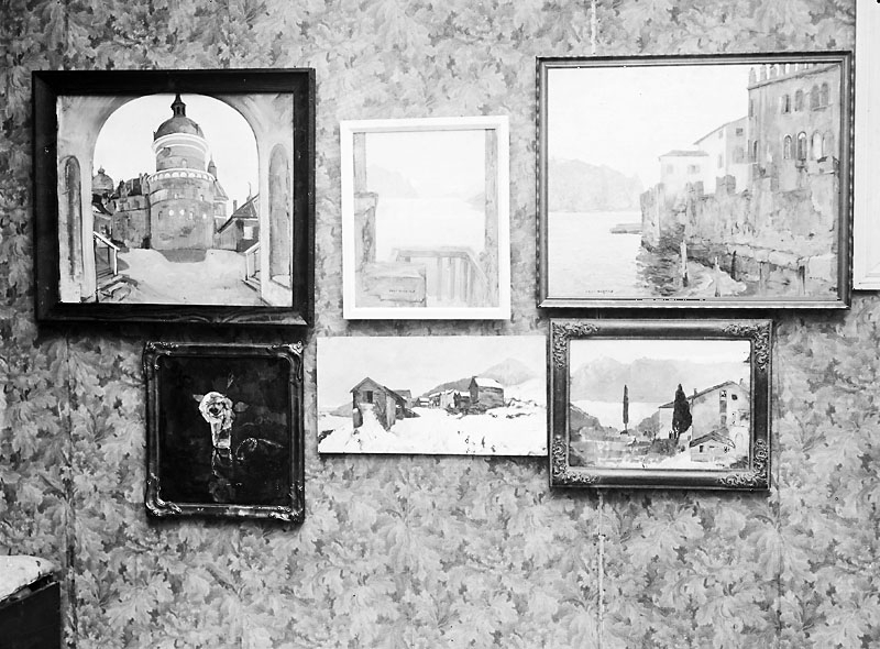 Vägg med sex tavlor. Fem bilder av hus. Ett stilleben med ros.