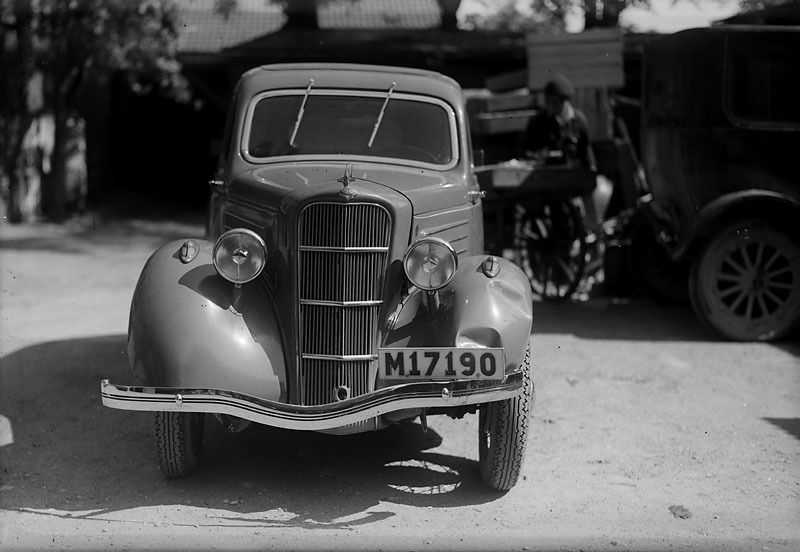 Titel: Frampartiet av krockad Ford ”kolliderad bil” registreringsnummer M17190 Svag metallutfällning, repor.