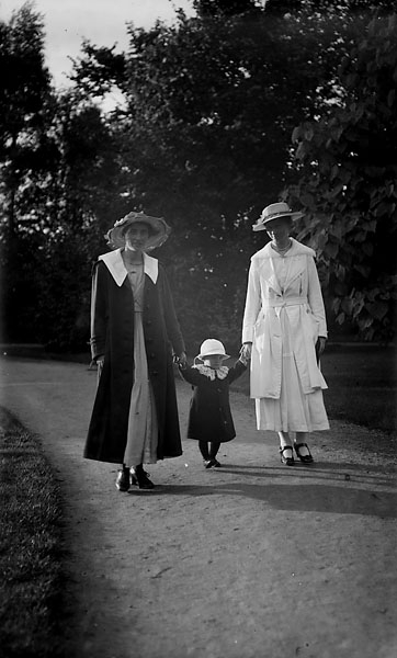 Agnes Johnson, med son + en annan kvinna i parken. Johnsons privata bilder metallutfällning, missfärgad.