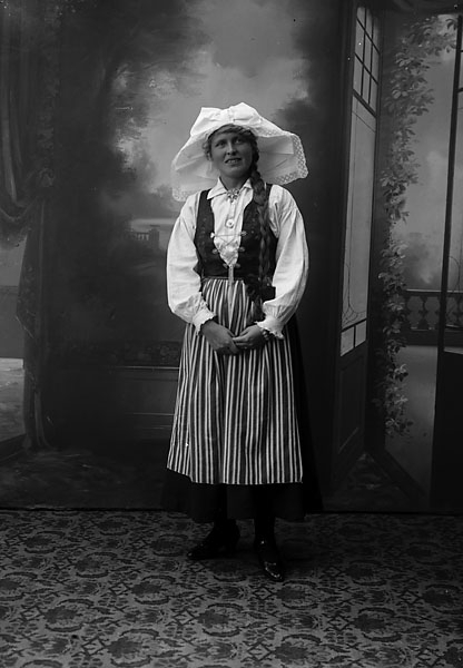 Ateljébild kvinna i folkdräkt, ”vy 1917 B” på asken