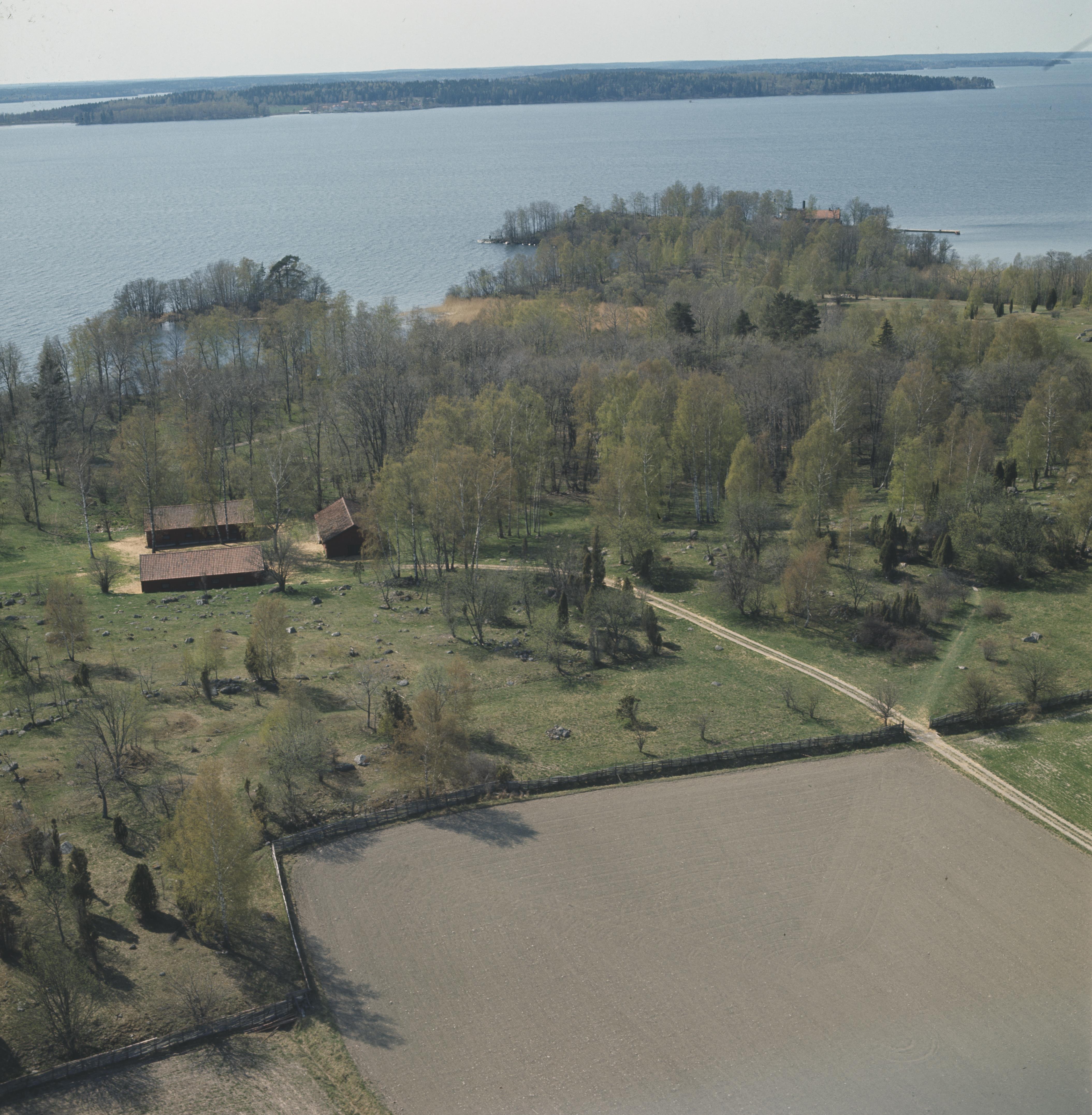 Björkö från öster med Kvarnbacka i förgrunden och Ångholmen i bakgrunden.