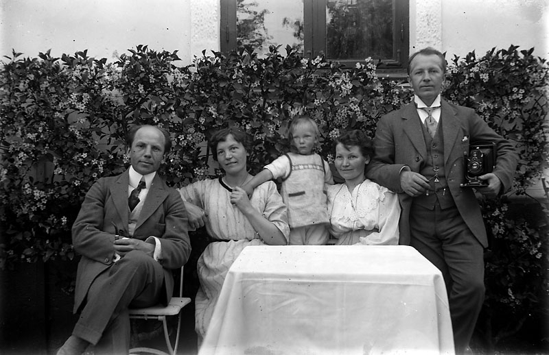 Två män, två kvinnor & ett barn sittande i en trädgård, Johnssons privata bilder