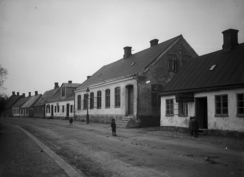 Gatubild Wennströms skomakeri i förgrunden, ”vy 1920” på asken