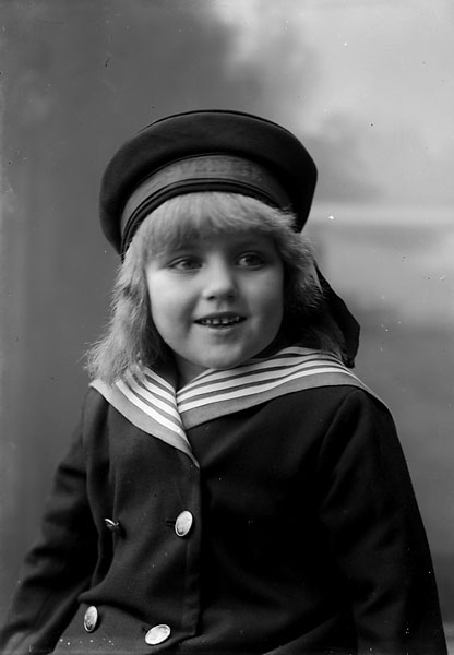 Ateljébild, liten flicka i sjömanskostym ”vy 1917 J” på asken