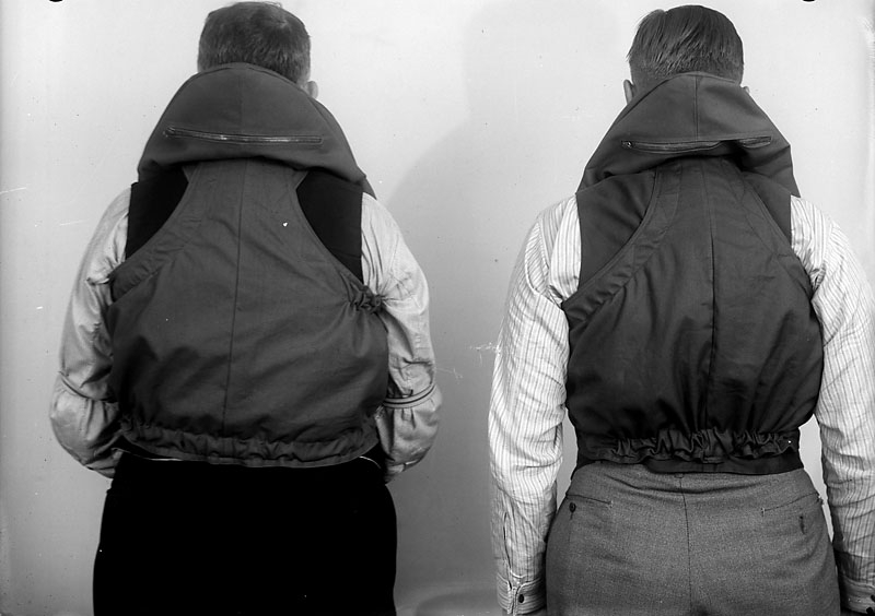Ateljébild, två män i flytvästar Gummifabriken 1936