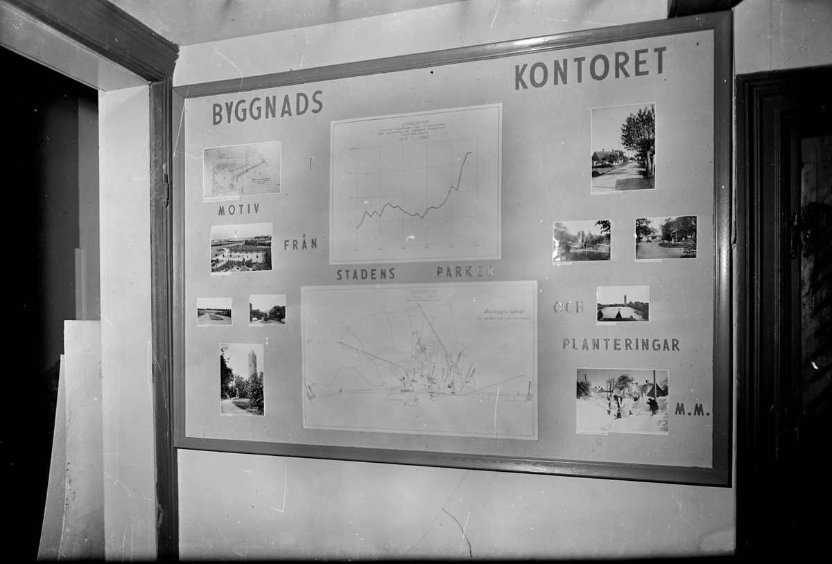 Trelleborg 75-årsjubileum 1942. Skyttsgården utställning. Skärm Byggnadskontoret.