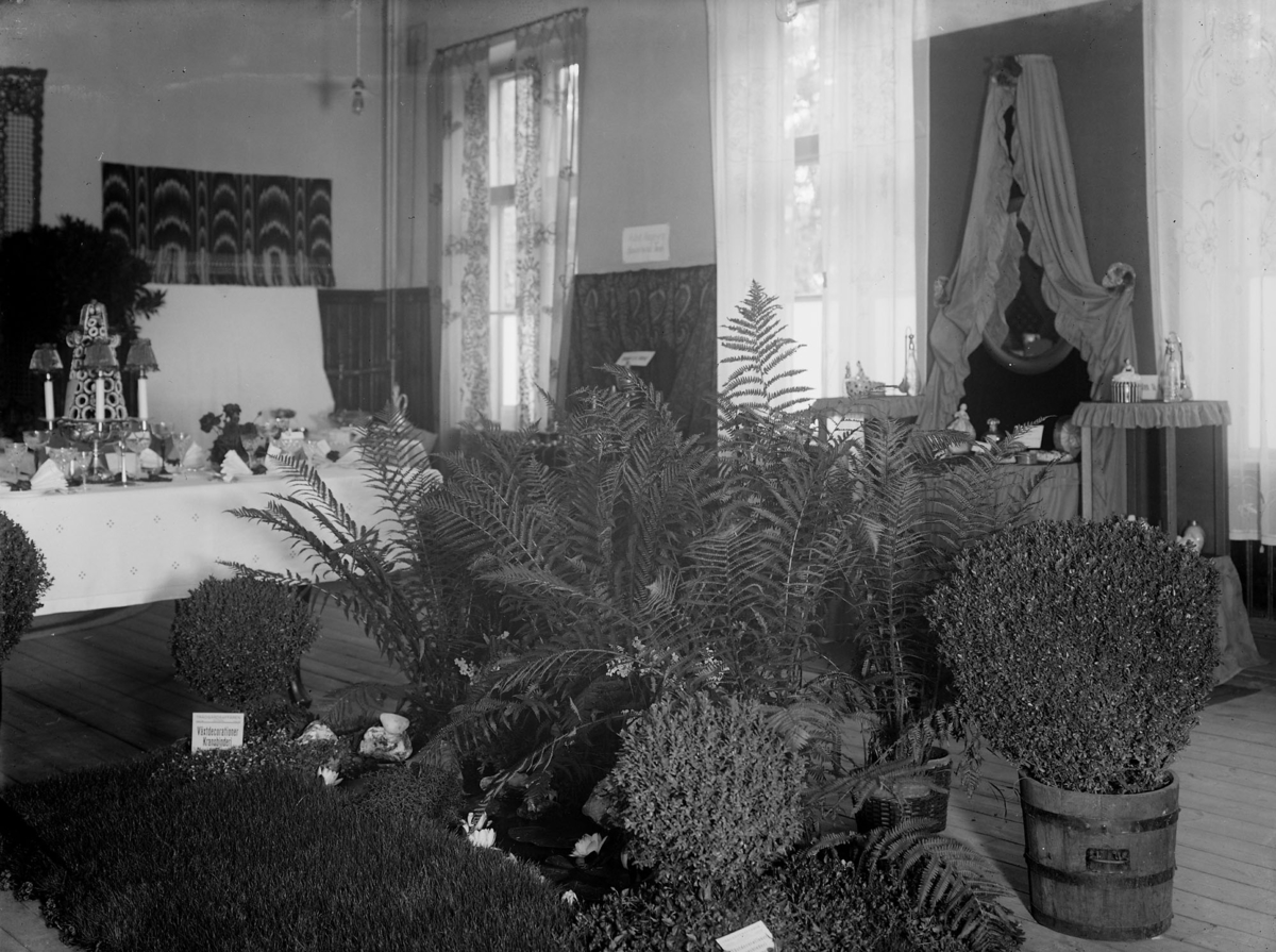 Malmöhus läns hemslöjdsutställning 1931. Skytts, Oxie, Wemmenhögs härad. Krukväxter i förgrunden. Konsthantverk i bakgrunden.