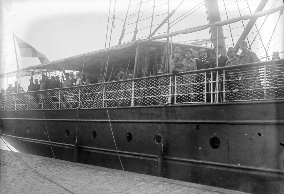 Krigsfångeutväxling i Trelleborg under första världskriget. Soldater på ett fartyg i hamnen.