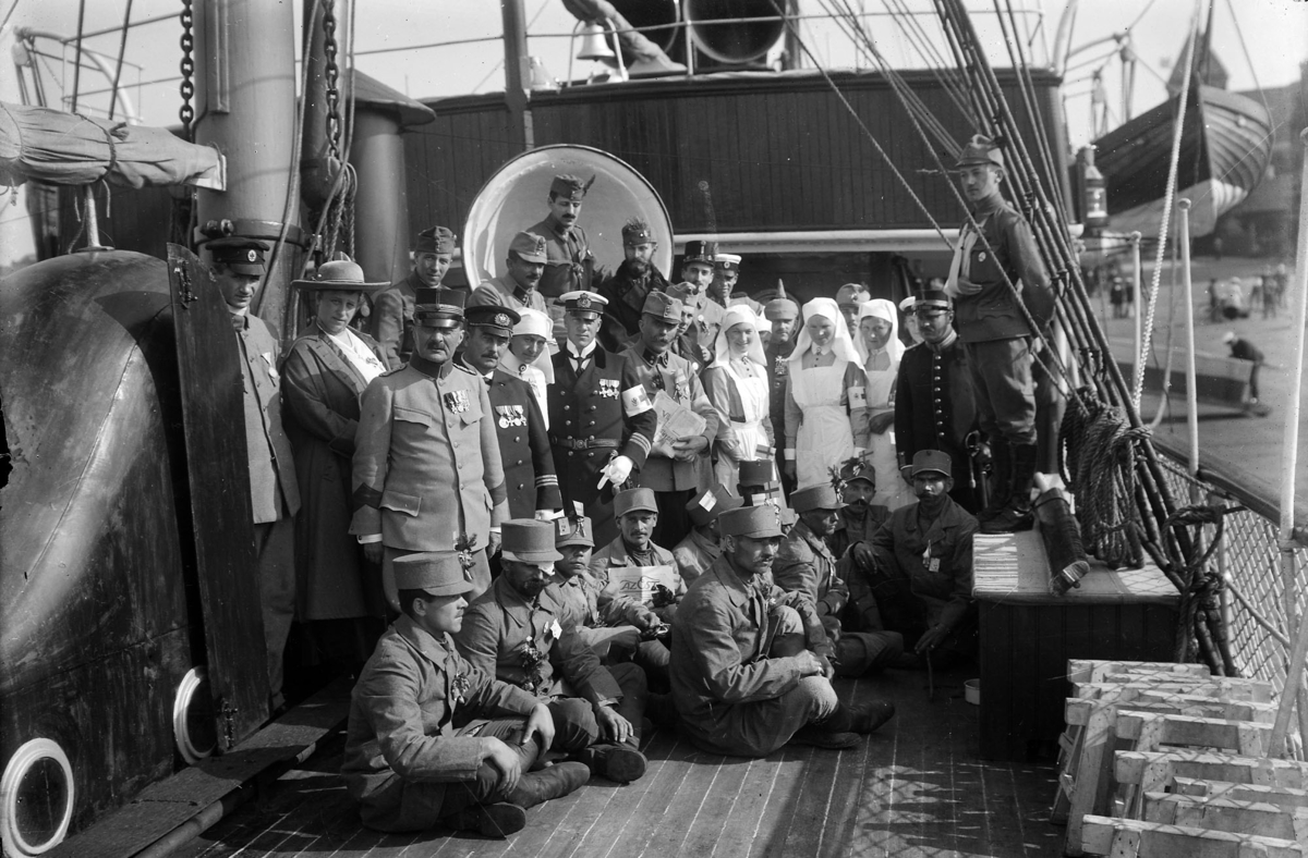 Krigsfångeutväxlingen under första världskriget. Soldater och sjuksköterskor på ett båtdäck.