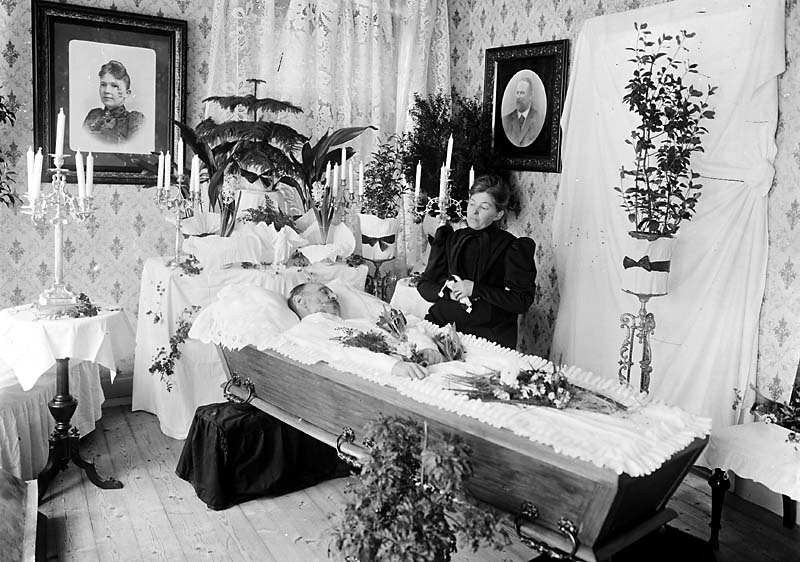Äldre man på lit de parade i hemmet. Blommor och kandelabrar.