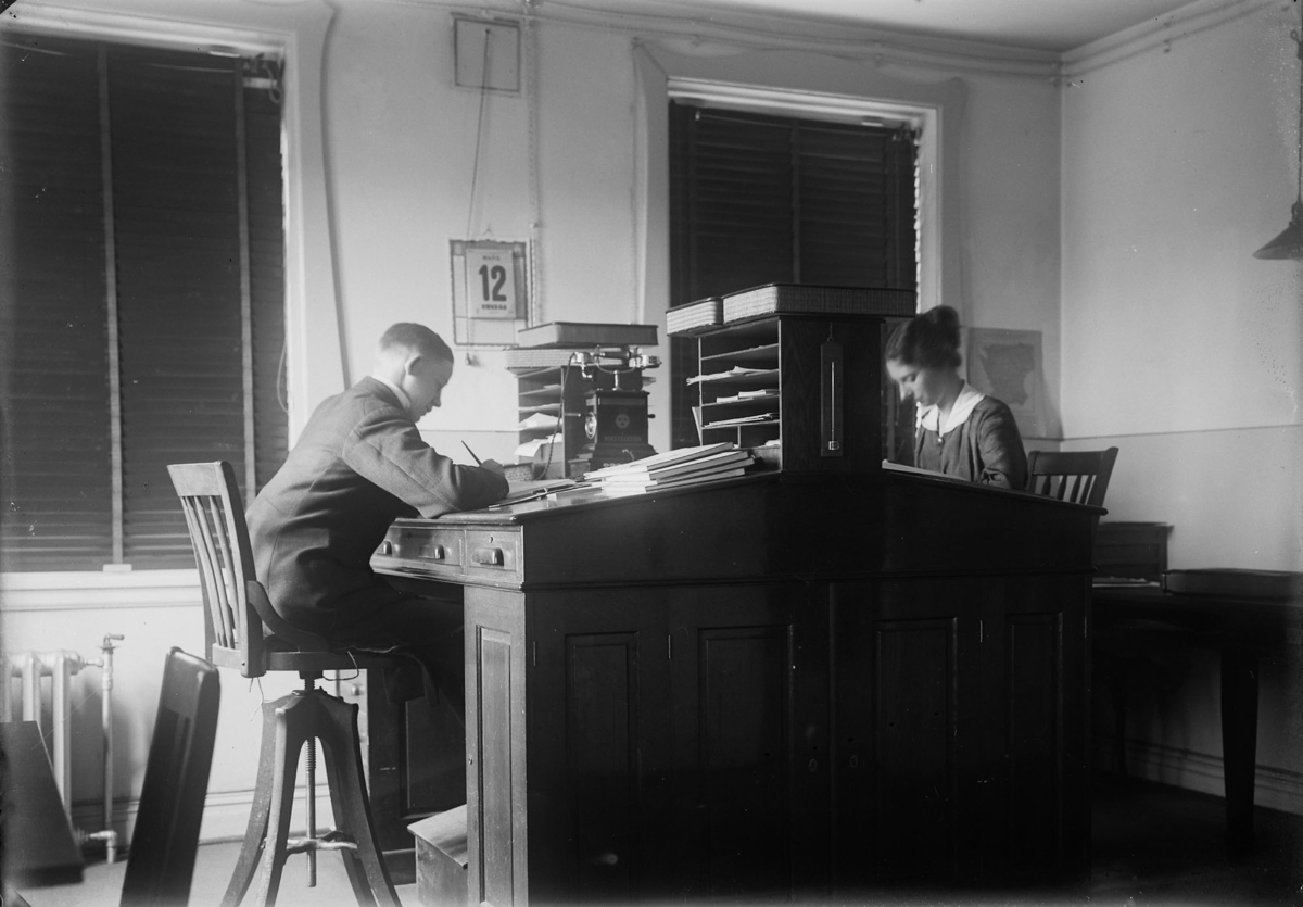 Färgfabriken Standard Kontorslokal, man och kvinna vid skrivbord.