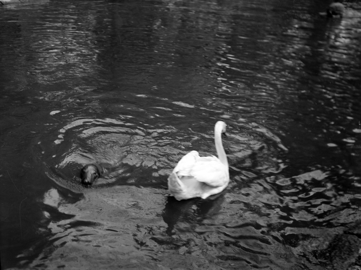 Sälen Isak tillsammas med en svan i stadsparken.
