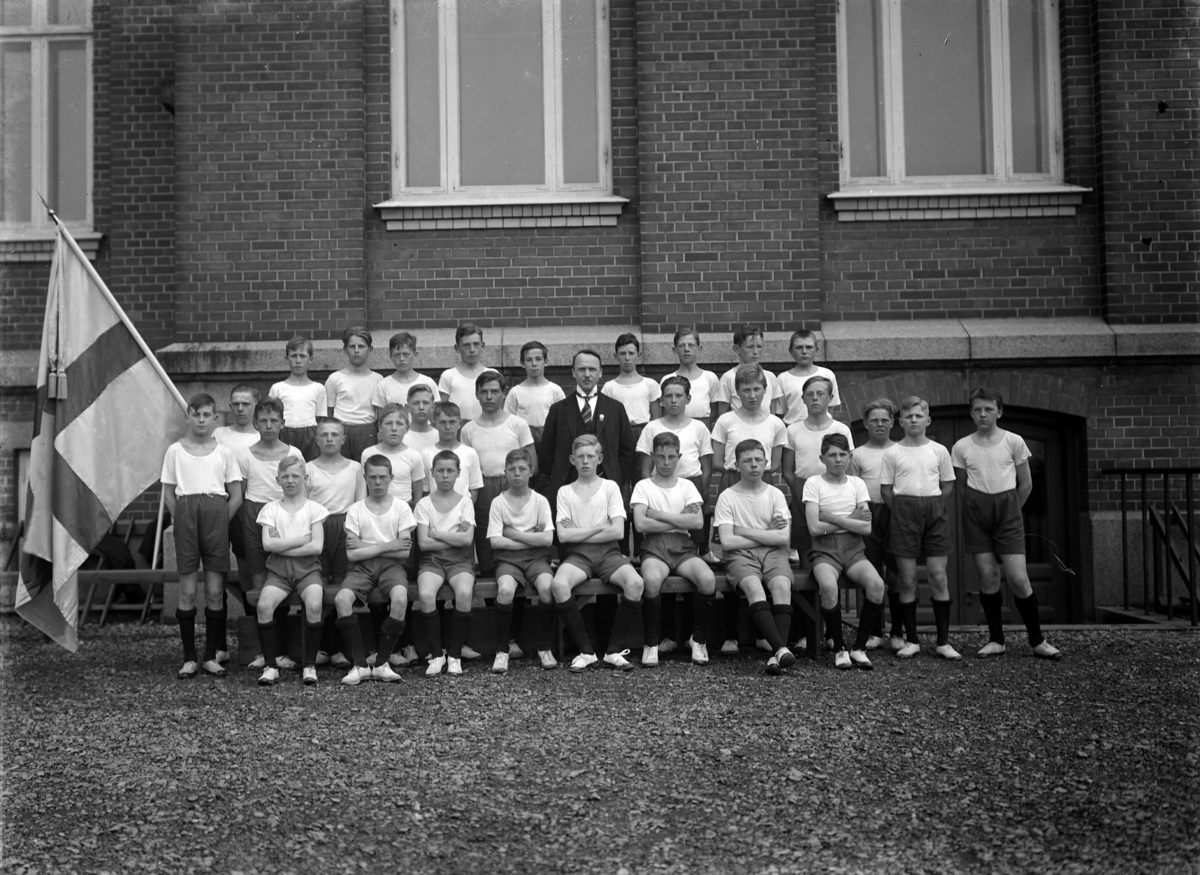 Österlinds gymnastikgrupp. Många pojkar klädda i gymnastikdräkt. En pojke håller en svensk flagga.