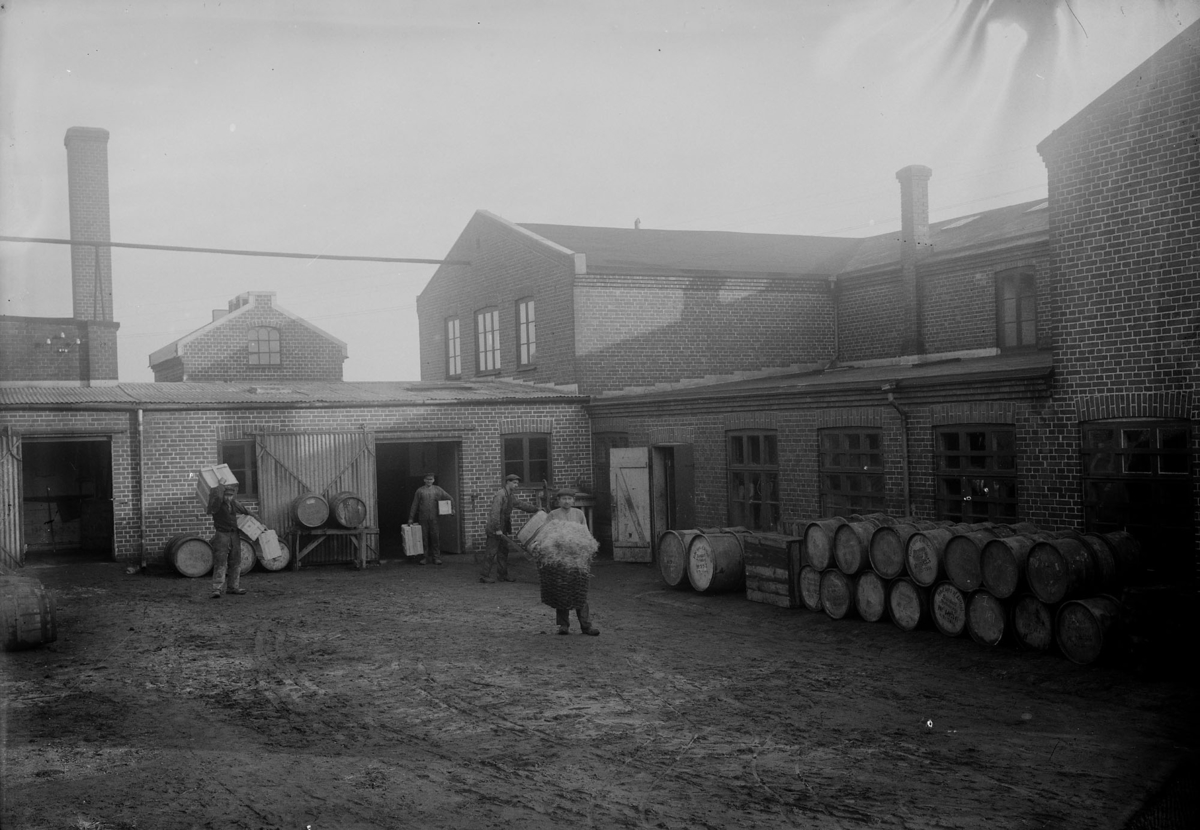 Färgfabriken Standard. Exteriör. Fyra arbetare.