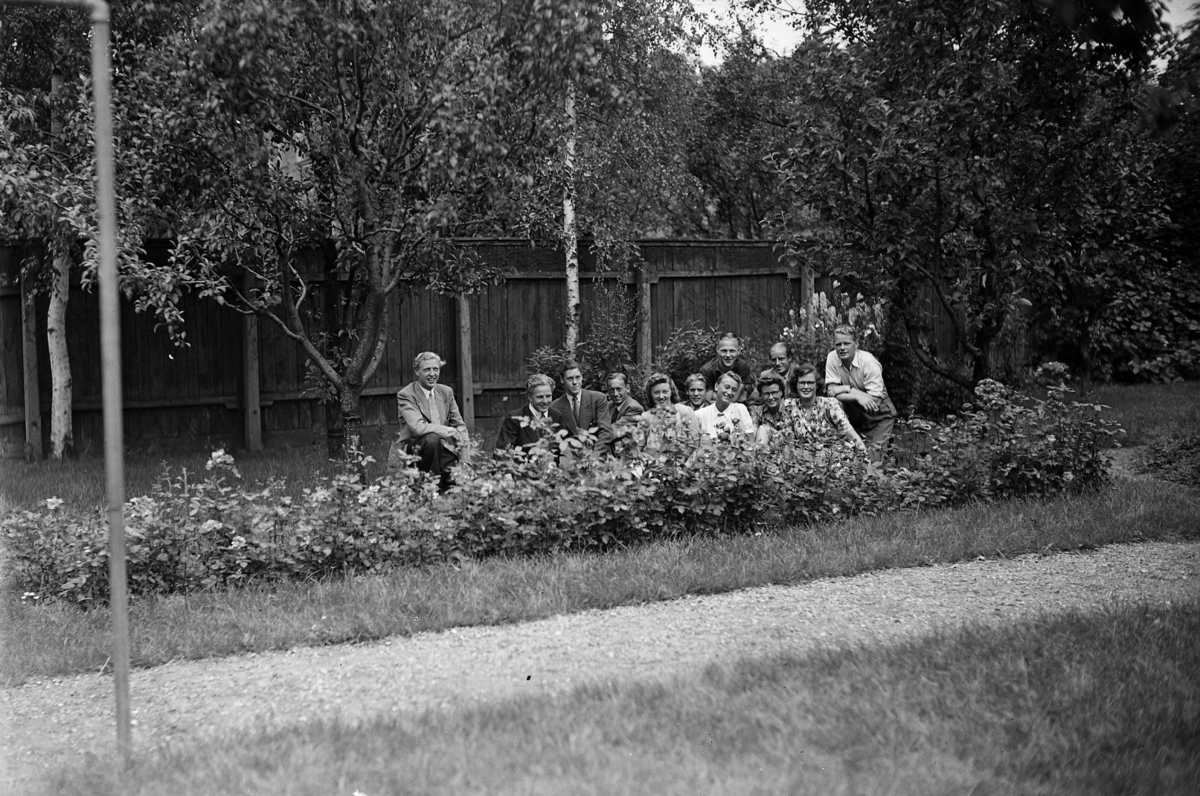 Nordisk transport. 12 ungdomar sittande bakom en blomrabatt. Längst till vänster: Carl Axel Åkerman.