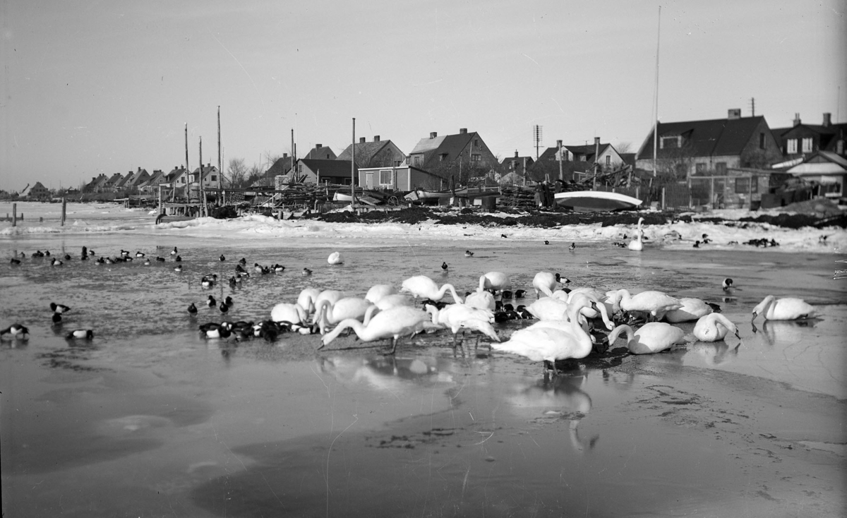 Många svanar och ankor vid stranden.