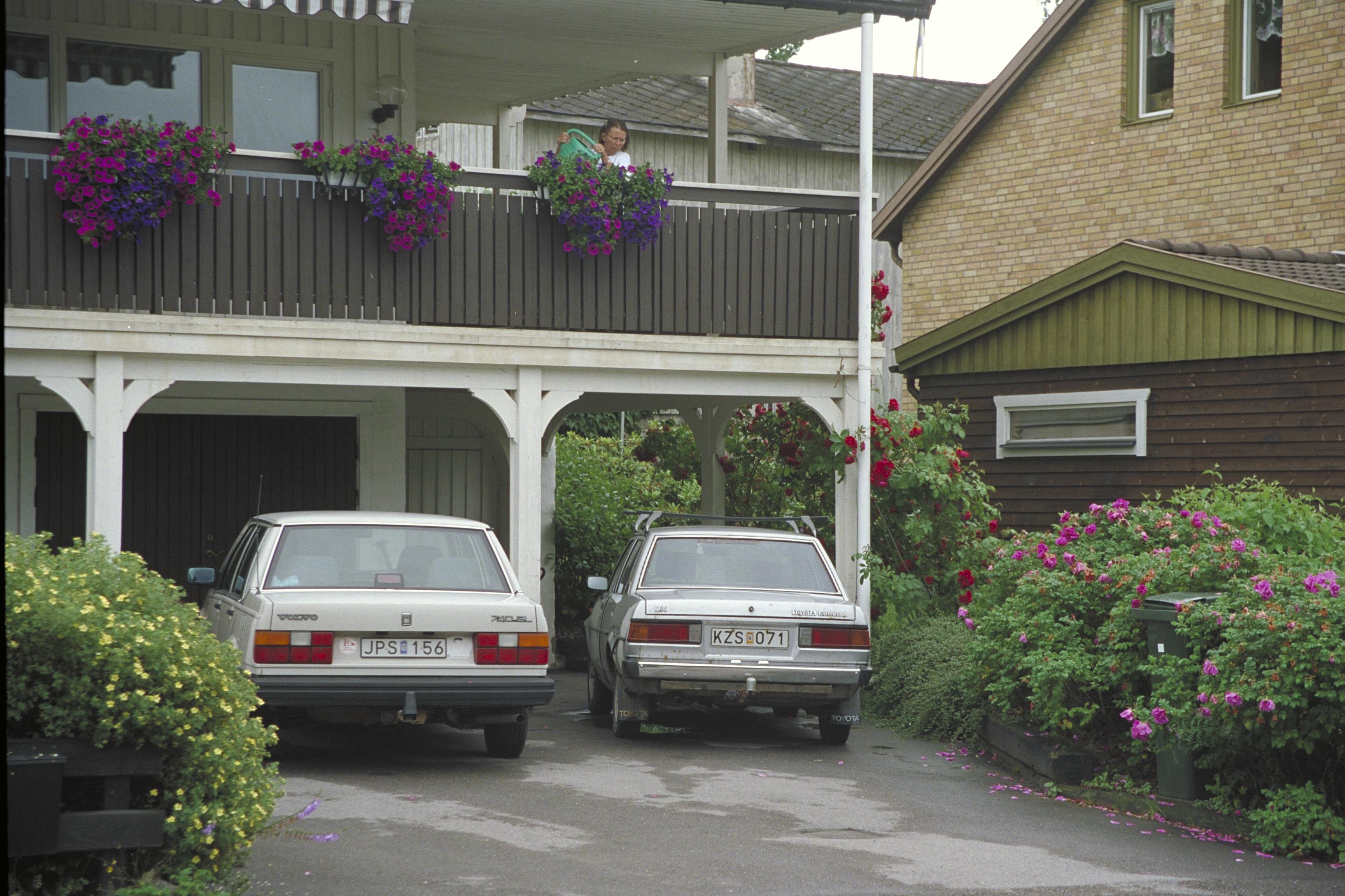 Bostadsområdet Karlberg, Årjängsgatan. Carportar med bilar.