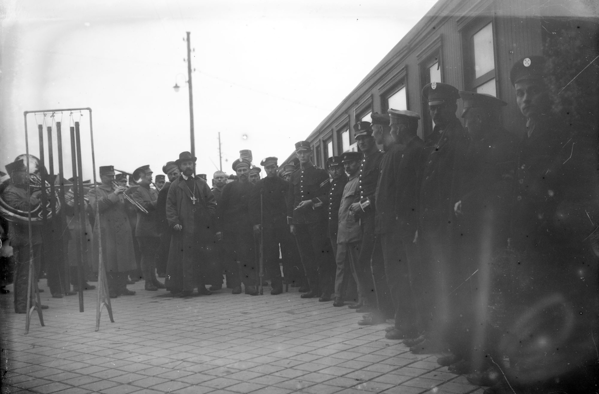 Titel: Krigsfångeutväxling i Trelleborg under första världskriget. Soldater, varav flera sårade, står vid ett tåg. En orkester spelar.