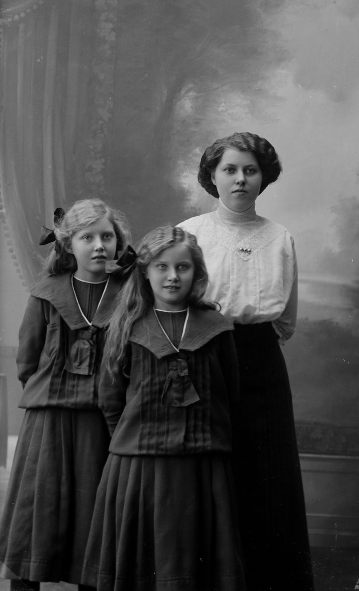 Ateljébild, kvinna och två flickor ”fröken Persson”.