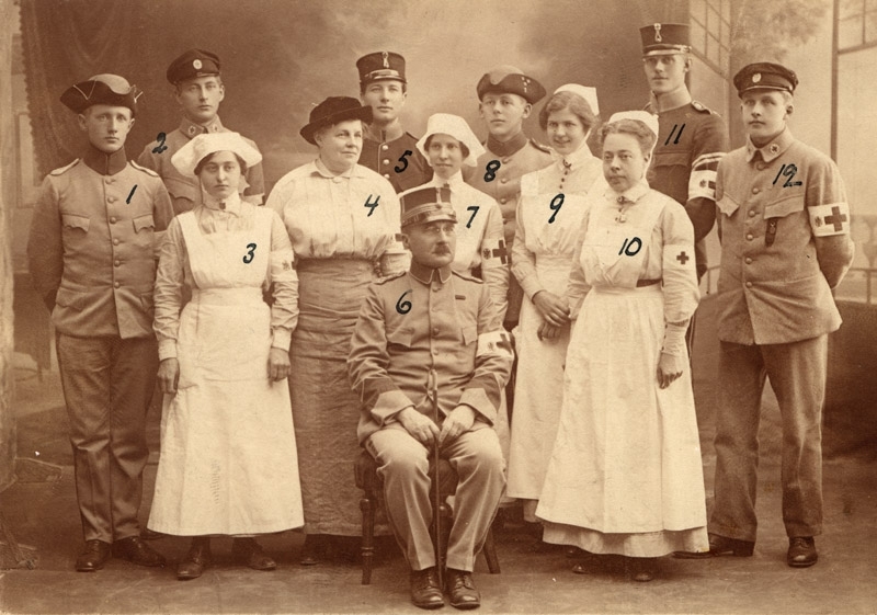 Röda korspersonal 1914-1918 ateljébild, Dr. Eneroth tjänstgjorde nästan hela tiden som chefsläkare på invalidtåget, 1 Axel Jonsson redogörare, 2 Bror Sjökvist sjukvårdare, 3 Elin Wenster sköterskebiträde, 4 Nanny Hägg tolk, 5 Gösta Norberg sjukvårdare, 6 Dr. Carl Ekeroth, 7 Helga Dahl sköterskebiträde, 8 Gunnar Euren sjukvårdare, 9 Gunhild Skantze sjuksköterska, 10 Gerda Ekelöv, 11 Oskar Bergström sjukvårdare, 12 Henry Persson, 13890.