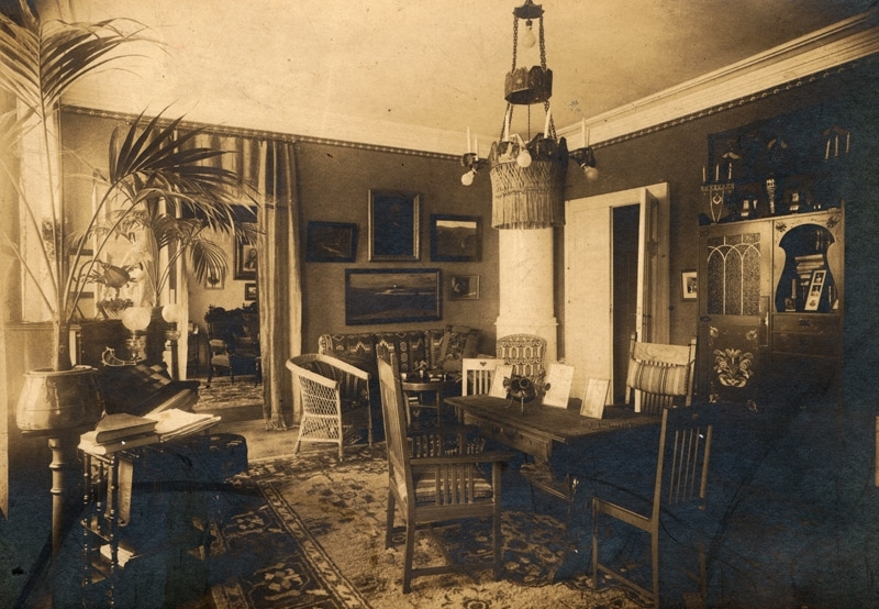 Stort rum med bord och stolar, kakelugn i hörnan.