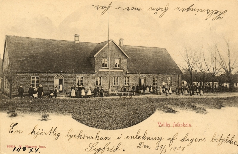 Vykort av Vallby folkskola,29/3 1903, en hjärtlig lyckönskan i anledning af dagens betydelse. Sigfrid, Helsningar mor och far, 65851 N Jönsson imp.10874.