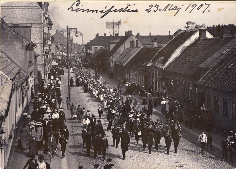 Linnéfesten algatan i Trelleborg, vy mot ost, 23maj 1907, negativ 18x24 70:8184, repronegativ finns 930610, foto L H Borgström.