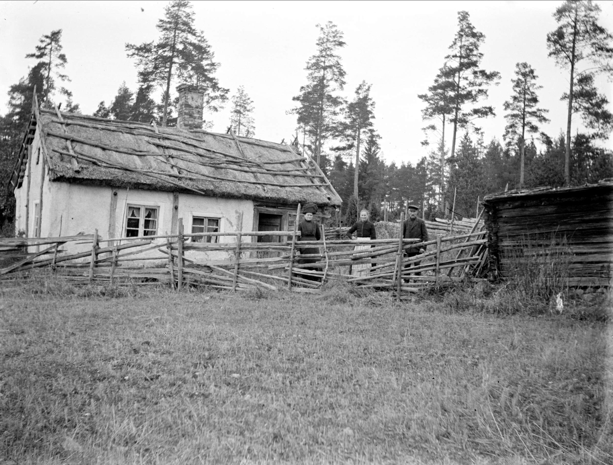 Kvinnor och man framför Lovisa Jansdotters torp på gränsen mellan Litslena by och Hällby gård, Litslena socken, Uppland, 1910-tal