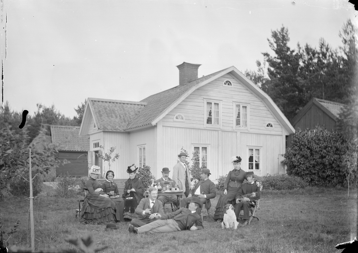 Järnhandlare J L Björkman med umgänge i trädgården, Uppsala 1884
