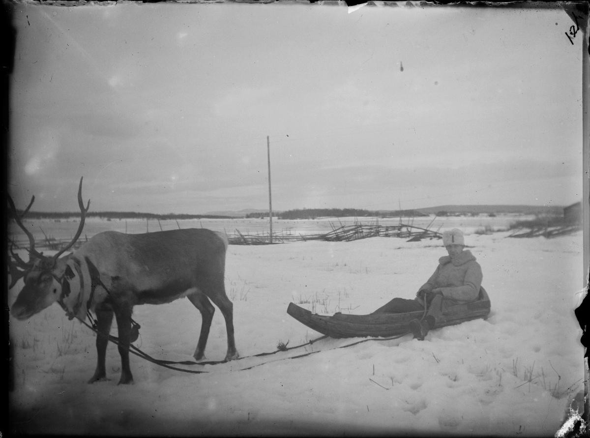 Man i uniform sitter i pulka dragen av en ren, Sverige