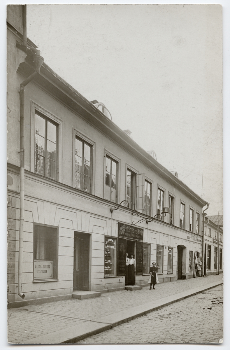 Postkort - Maria (Mia) Petersén och Ragnhild Nyman utanför hattfabriken Aug. Ekströms Eftr. på Svartbäcksgatan 8, Uppsala, omkring 1910