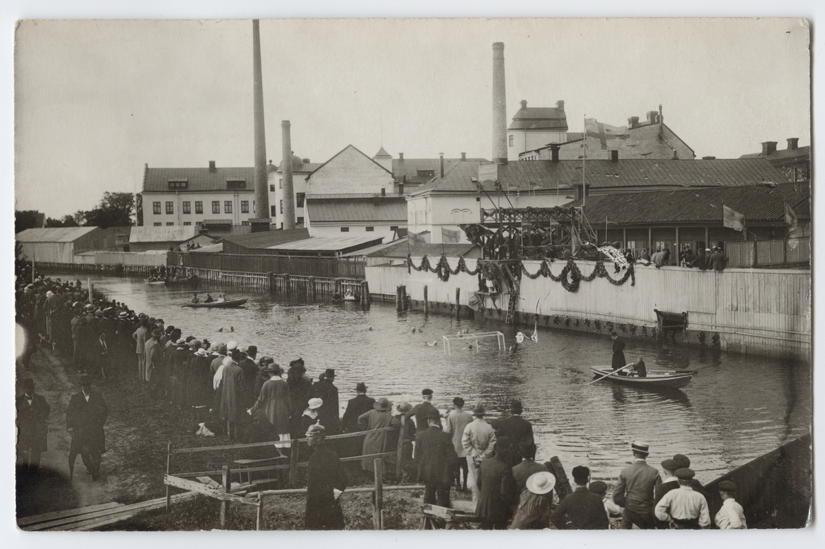 Postkort - vattenpolomatch vid simpromotion i gamla kallbadhuset, Svartbäcken, Uppsala, omkring 1920