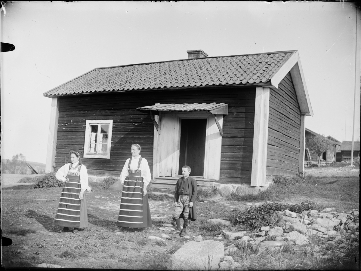 Kvinnor och pojke i folkdräkt framför stuga, Dalarna