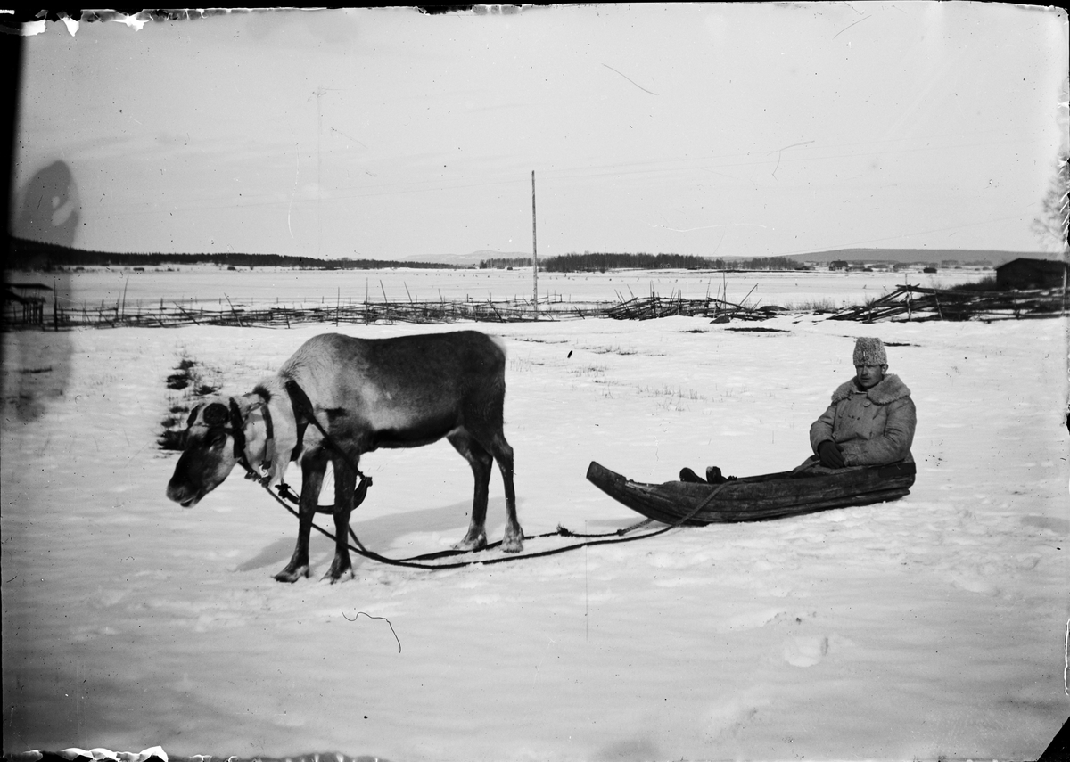 Titel: Man i uniform sitter i pulka dragen av en ren, Sverige