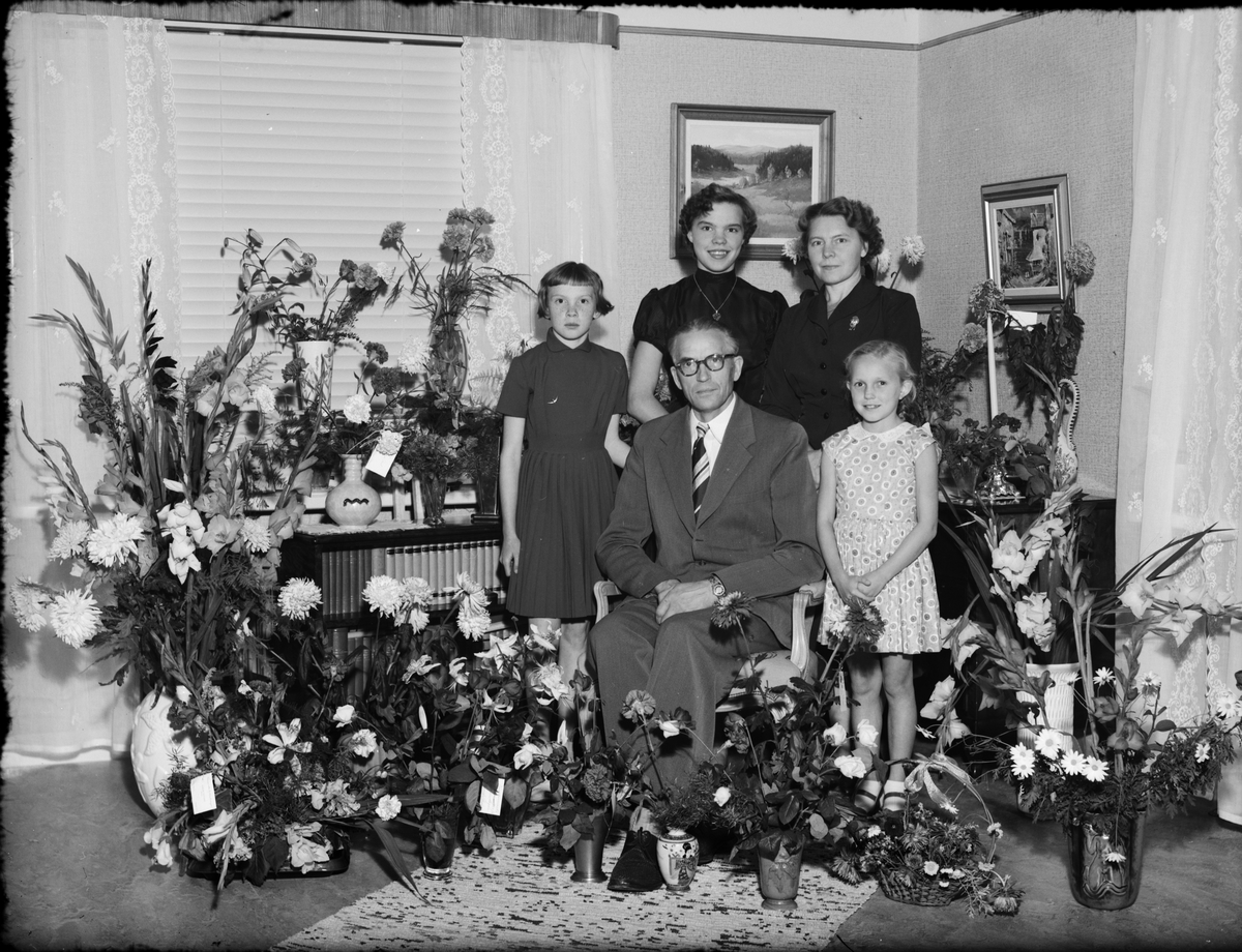 Familj omgiven av blommor i bostadsmiljö, Östhammar, Uppland