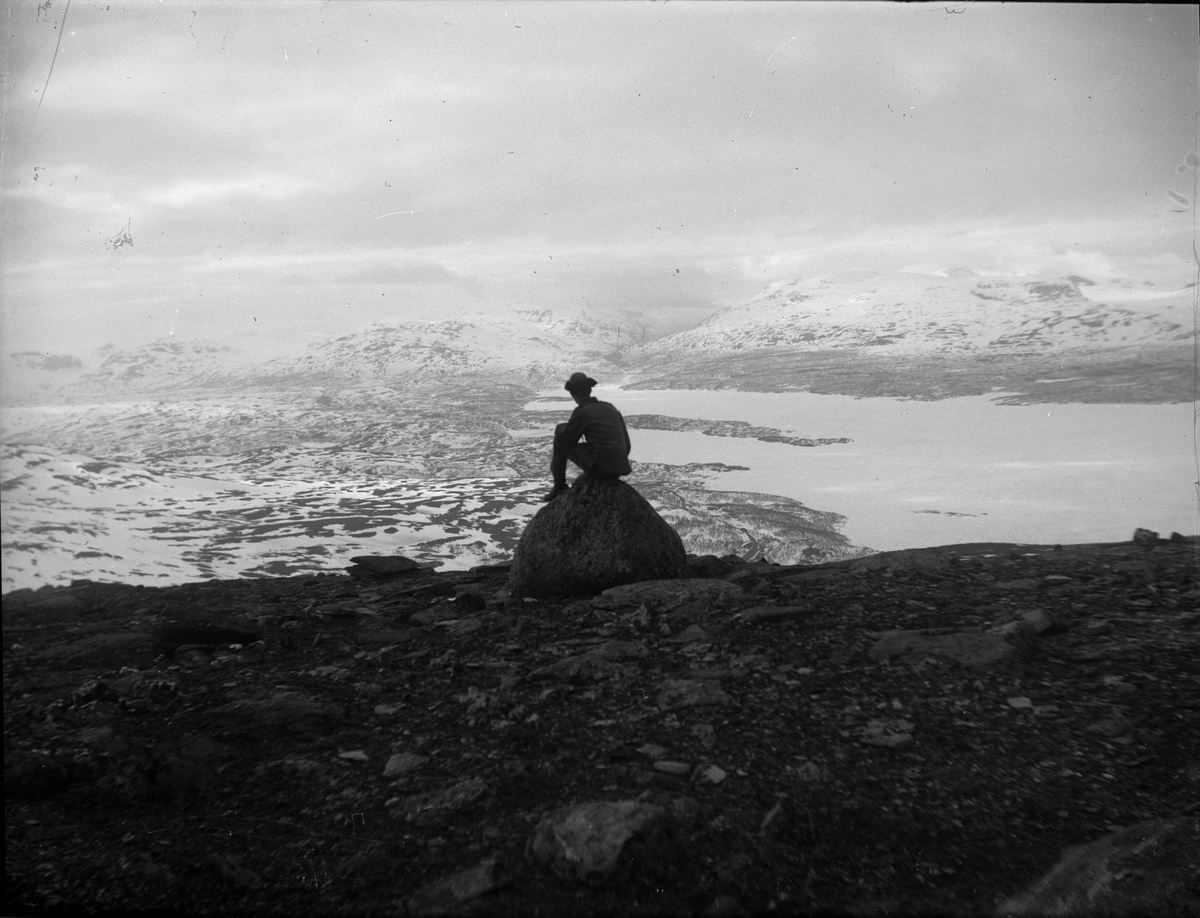 Man i uniform sitter på en sten och ser ut över fjällvy, Sverige