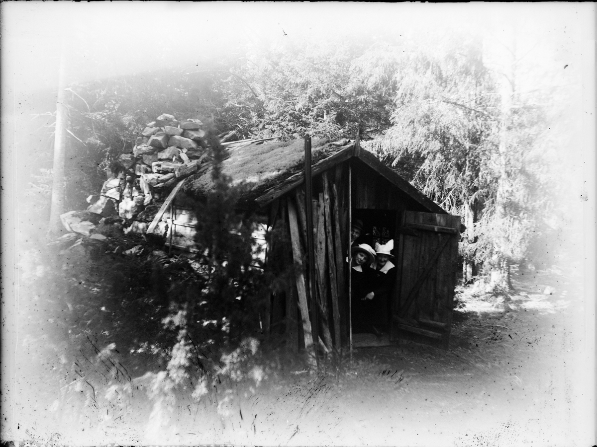Man och kvinnor tittar ut från ekonomibyggnad, Östhammar, Uppland