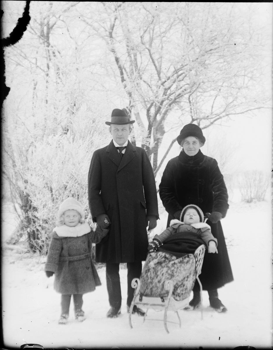 Man och kvinna med två barn, ett barn ligger i en kälke, Östhammar, Uppland