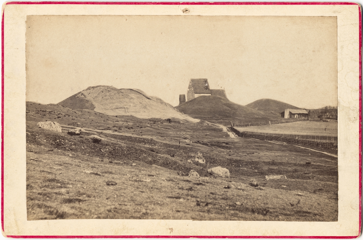 Kabinettskort - kyrkan och högarna, Gamla Uppsala, Uppland