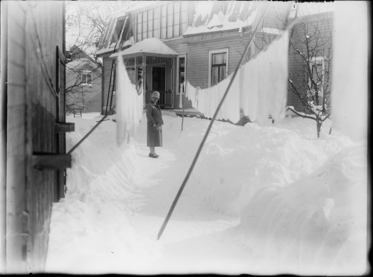 Gerda Edhlund vid tvättlinor utanför familjen Skötsner-Edhlunds bostadshus i Östhammar, Uppland