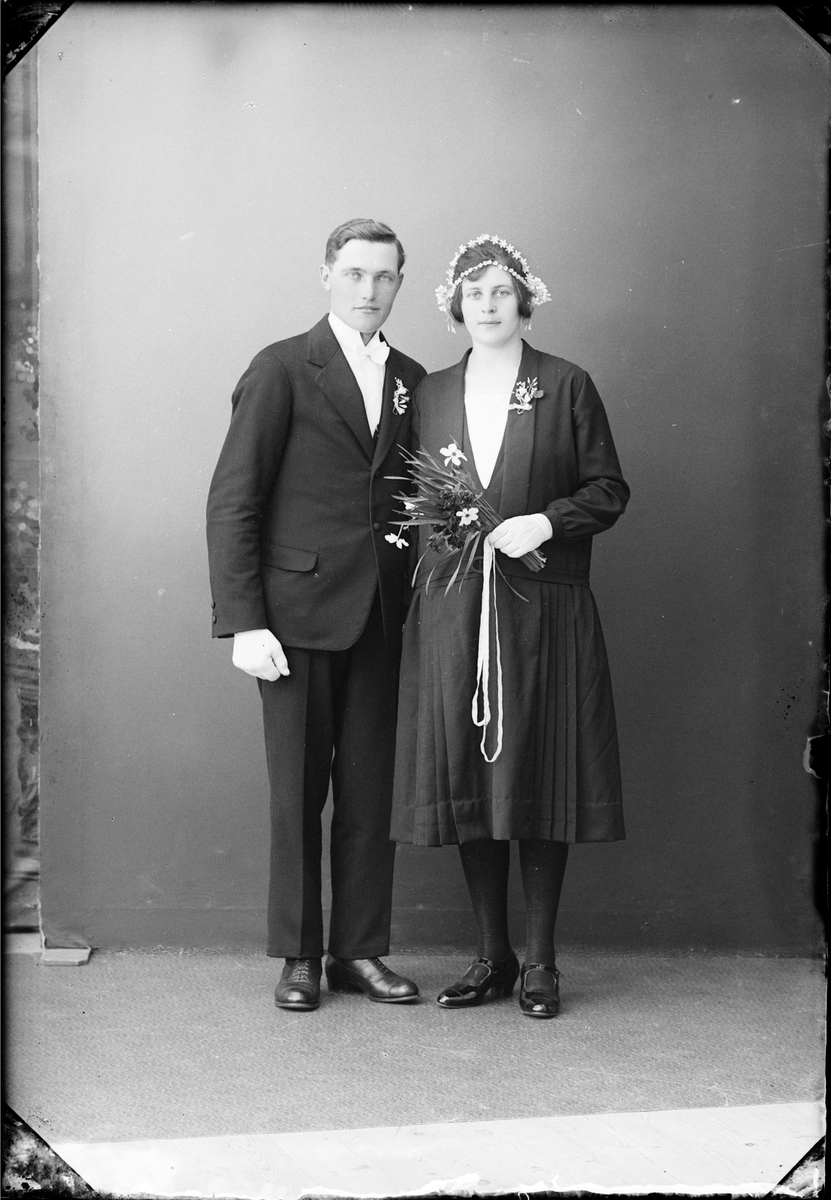 Ateljéporträtt - Brudparet Larsson från Harg socken, Uppland 1927